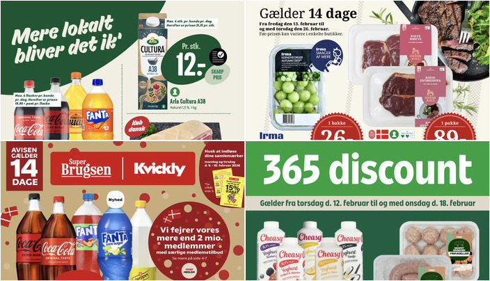 SuperBrugsen tilbyder Coca-Cola, Fanta eller Schweppes i flere varianter (125-150 cl) til en pris på kun 11 kr. pr. flaske. Dette tilbud gælder fra fredag den 6. februar til og med torsdag den 19. februar.